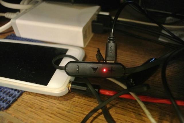 USB給電の充電用ケーブル 左右ハウジングをつなぐ長めのケーブルを纏めるためのクリップが2個