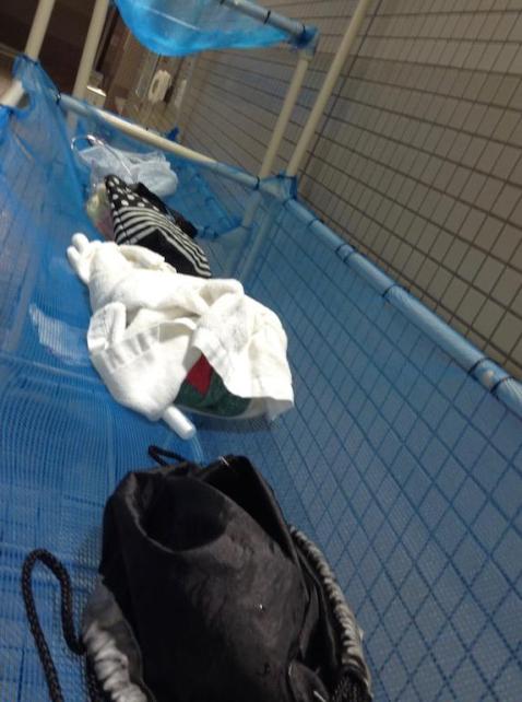 Q31も一緒に連れ出したのですが、25メートルプールの中間地点横にある荷物置きに