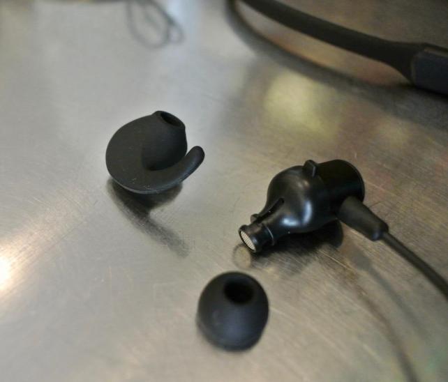 写真に見えるような形にある程度固定整形されたネックバンドは、ほとんどのユーザーの首周りにフィットするので、通常のケーブル型イヤホンに付属しているアダブターは必要ありません。
