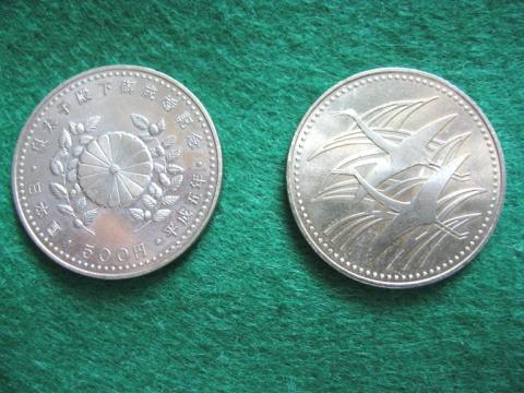 皇太子殿下御成婚記念500円記念硬貨も図柄の題材は金貨・銀貨と同じですが、こちらも見比べると表面の鶴の図柄が若干違っています 直径は26.5mm・量目は7.2gで、品位は銅が750に対してニッケルが250、発行数は金貨・銀貨よりも圧倒的に多い3000万枚が発行されました。 「皇太子御成婚500円白銅貨」の価値は完全未使用の美品状態で1800円前後であり、買取価格にするとおよそ1000円前後が相場となります けれども発行数が多くプレミアム価値は期待できないため、500円硬貨単体では買取を断られる可能性もあります。