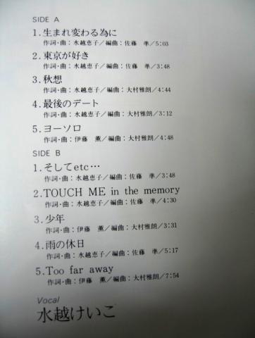 水越けいこのアルバム第三弾で、「東京が好き」、「TOUCH ME IN THE MEMORY」, 「Too far away」が聴き処ですか... アルバム内で弾けるように歌っているわけでもなく、ややメランコリーな感じですね。