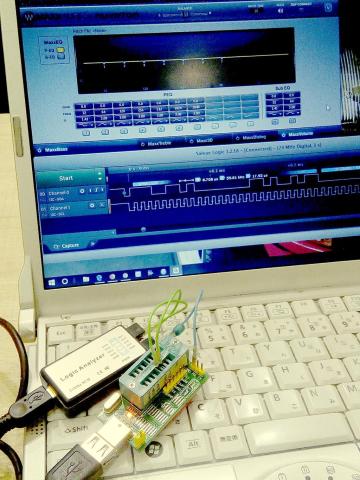 そこでつい先日購入したばかりの激安ロジックアナライザの出番です。I2Cそのものが動作していないのか、動作はしているものの、期待したデータが創出されていないのか?の切り分けに使用してみました。(I2Cが出力されているか確認するだけなので、MaxxDSP ICには接続していません)