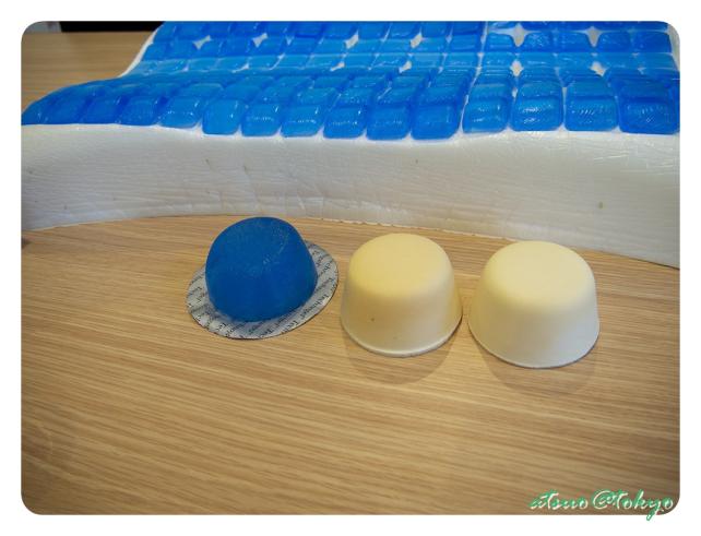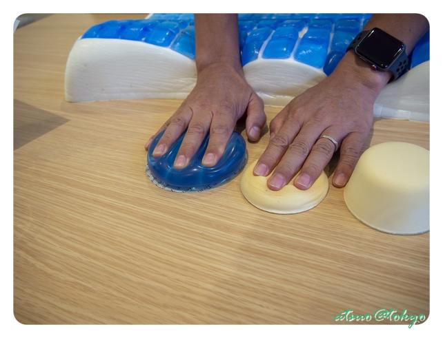 気を取り直して説明の内容に戻りますが、比較の為に高反発ウレタンと低反発ウレタン、それと肝であるジェルの見本と枕の中身を使って、実際に素材に触れながら説明を受けました。
