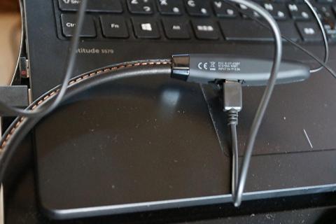 この写真ではオレンジ色のように見えてしまいますが、実際には充電時はLEDが赤く点灯します。もっとも、出荷時点で概ね充電されているようで、DELL Latitude15 3570のUSB端子でも10分程度経過して確認したところ消灯していました。