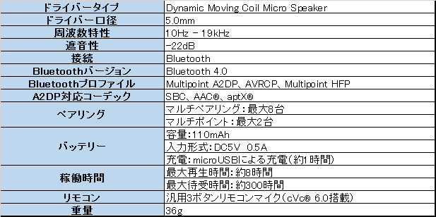 対応プロファイルはMultipoint A2DP、AVRCP、Multipoint HFPとなっていますが、これはオーディオ機器としての接続、電話機用ヘッドセットとしての接続のどちらでもマルチペアリング(複数台のBluetooth機器との接続情報を保持)に対応していることを意味します。