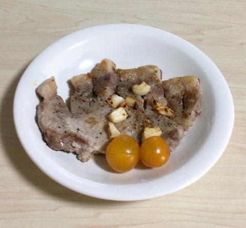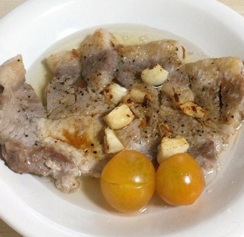 厚めに切った肉に下味(「粗挽き胡椒」と「赤穂の塩」)を付けたら、少量のオリーブ油に刻んだ大蒜を加えてフライパンで炒めるだけ。