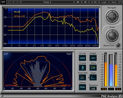 FFTとは対照的に、PAZはウェーブレット技法(周波数分布を波状に表示する技法?)を採用し高精度なグラフィカル表示を行います。レスポンス高速化のため周波数レベルの変化を各バンド間で独立してアップデートしますので、非常に高い精度と分解能でのオーディオ解析を実現しました。