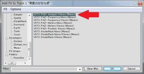 プラグインをインストール済みなら自動でSCANして表示されます 此処ではプラグイン・デベロッパーの「WAVES」を選択すると数種類のVSTが表示されます 色々表示されますが分割表示で種類は多いです 2から一番上のAnalyzer stereoを選択してOKをクリック(3つの機能をまとめて表示。