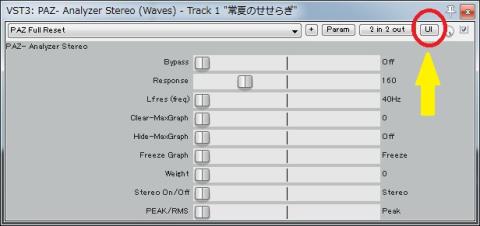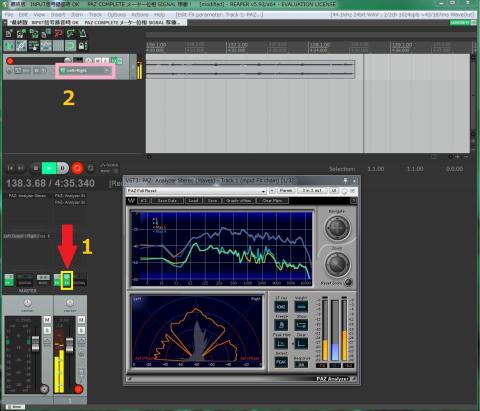 「FX :Track1」を×をクリックして白いFXのWINDOWSを消します すると下画面に為りますので①をマウスでクリックしてPAZ ANALYZER STEREOを選択、PAZ の設定画面が出るので触らないで右上のUIボタンをクリックするとPAZ画面が出ます この時PAZ画面の左下の位相画面が静止しているときは下画面②で「STEREO」にしますと位相表示もされます。