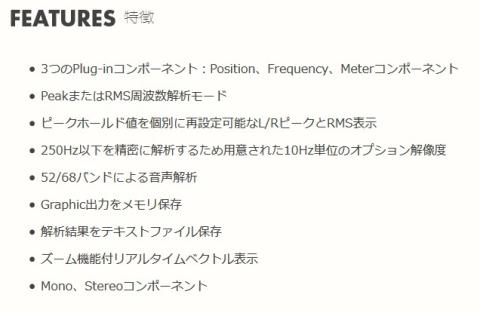 PAZ Analyzerはオーディオステレオポジショニング、周波数スプレッド及びPeak/RMSレベルの総合的でリアルタイムなビジュアル効果を生成 PAZは人間の聴覚特性に基づいた52バンド(最大68バンド)のリアルタイムアナライザで、RMS/ピーク検出モード、ウェイトカーブ切り替え、可変レスポンスタイム等の機能を搭載 人間の耳の働きを演算によって再現し、ありのままのオーディオ信号をディスプレイ上で確認することが出来ますと言うことです。