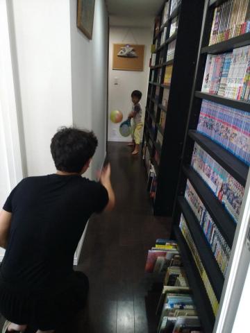 うちの廊下は本棚だらけなのですが、こんな場所でも器用に遊べるものです。