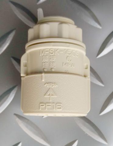 反対側はPF管を抑え込むバネ式のプラスチックで、1枚目の画像に「解除」「接続」って文字が見えたかと思うのですが、解除側にしてPF管を差し込んで接続側に回すとPF管が抜けなくなります。