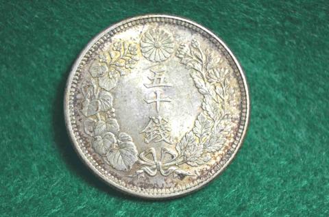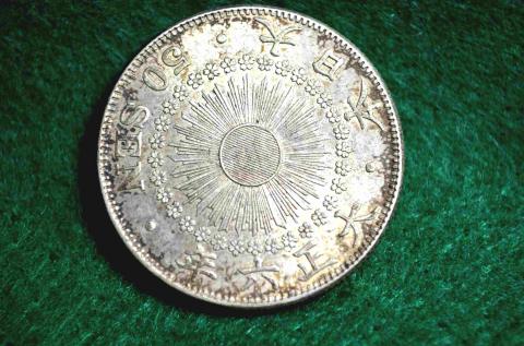 大正元年〜大正6年(1912年〜1917年)にかけて発行された旭日五十銭硬貨です。表面には「五十銭」、菊花紋章が描かれ、裏面には旭日が描かれています。重量10.13g、銀の品位80%。
