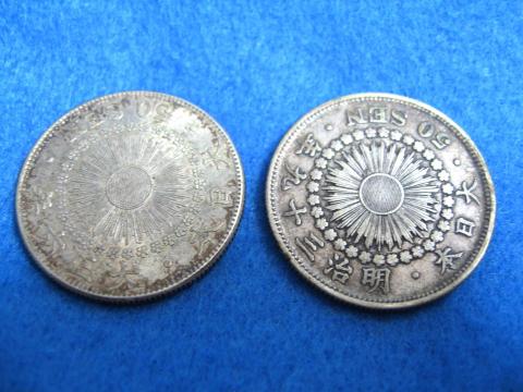 左、大正6年銀貨 右は明治39年 大正銀貨は刻印が薄く大日本の文字が大きくなってます シリーズとしては別個の発行みたいですね 文字は明治時代製造品より大きくなっています。