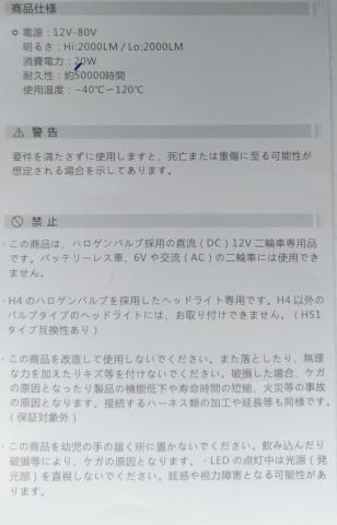 いかにも中華製らしいどれが本当?な記載ですが、メーカーによれば箱の記載が違ってて12-24V Hi/Lo各30Wが正しい記述だそうな。。。(´Д`)