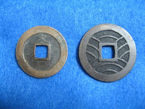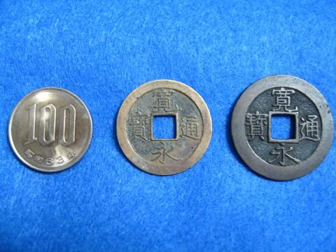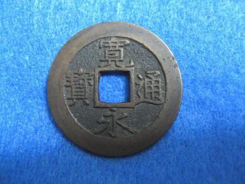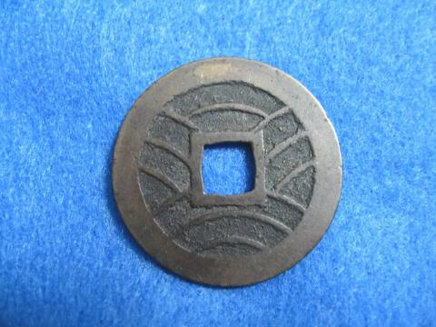 寛永通宝(かんえいつうほう)は、日本の江戸時代を通じて広く流通した銭貨。寛永13年(1636年)に創鋳、幕末まで鋳造された。 寛永通宝のうち、万治2年(1659年)までに鋳造されたものを古寛永(こかんえい)と呼ぶ。その後しばらく鋳造されない期間があり、寛文8年(1668年)以降に鋳造されたものを新寛永(しんかんえい)と呼ぶ。この古寛永と新寛永は、製法が異なり、銭文(貨幣に表された文字)の書体も顕かな違いがある 今回のは寛永通宝でも4文銭です 4文は硬貨の裏側が波模様ですが小型の寛永通宝は1文です 寛永通宝は1000種類くらいあるそうです。