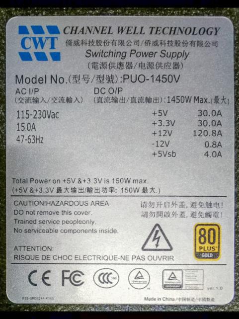 CWT製 ITC取扱い 1450W 80Plus Gold認証電源 PUO1450V