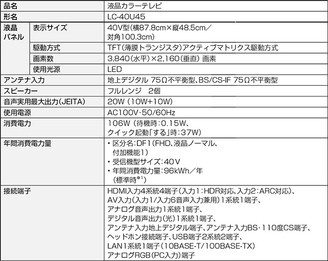 色々物色した結果、4K HDR 対応で多入力、しかも安価を条件に、SHARP製の LC-40U45を選択しました。