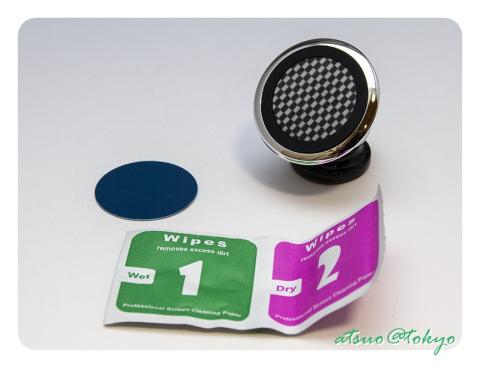 本体の他、スチールプレート(スマホ貼付用)とアルコールバッド(取付位置洗浄用)が付属しています。