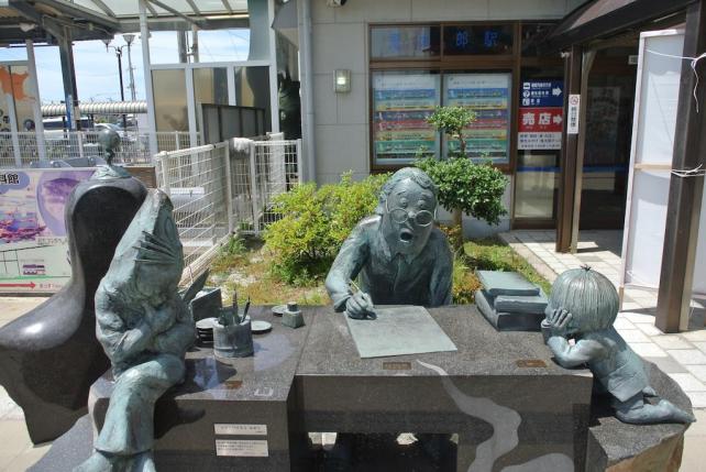 これは駅前のオブジェ 隻腕の水木しげる先生が原稿を仕上げるために汗をかいているところを