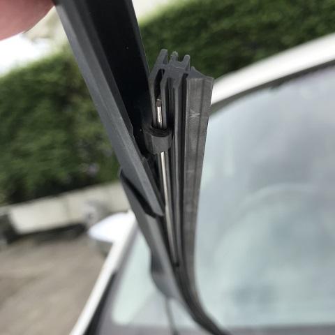 ゴムには金具を入れる溝、ワイパーブレードにある脱落防止の爪に通す溝がきちんと分かれているので、それさえ間違わなければ同じようにスルスル入っていきます。ワイパー自体、湾曲しているのでR状に差し込む必要があり、余りに長いと芯となる金具の為に多少キツイので急がずじわりじわりと溝に合わせて押し込んでいけば難しくはありません。