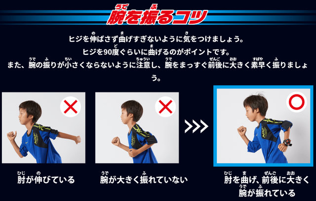 後、当然ながらミズノのサイトやゼクーの説明を見た上で、親が子供に走るフォームについて助言する必要はあります。