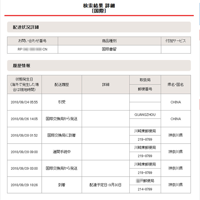 中国といっても広いので、中国の郵便局が受け付けたのが、発注から3日後です。