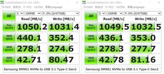 搭載したSSDは、本来シーケンシャルリードで3GB/sec程度の速度なのですが、USB 3.1 Gen2の仕様である、10Gbpsで頭打ちとなります。