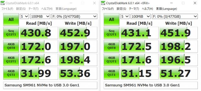 本来の NVMeの速度は出ませんが、それでも、SATA SSDを、USB 3.1 Gen2対応SSDケースに入れるより、倍近く高速に読み書きができます。