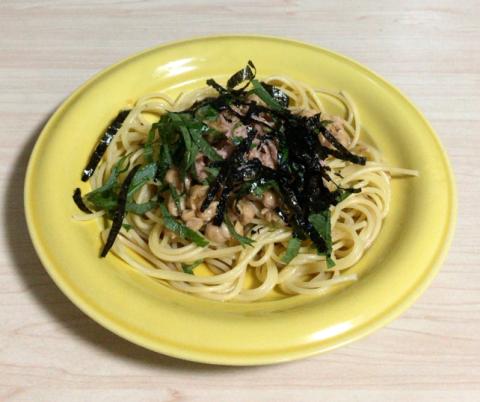これは、麺つゆを使った「納豆パスタ」です。
