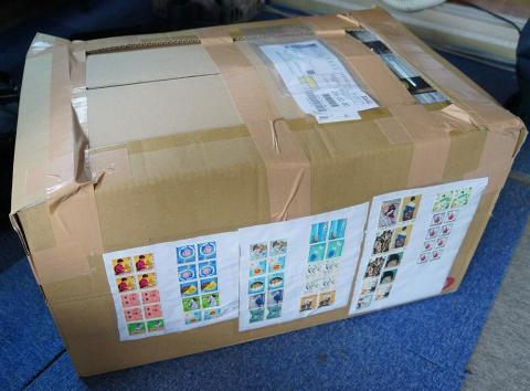 ところで、ゆうパックは切手で支払えるのですね。箱の側面にたくさんの切手が貼ってあります(1,800円分)。