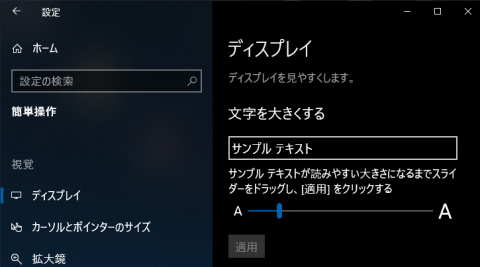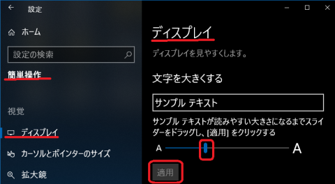 そこで「設定」-「簡単操作」-「ディスプレイ」-「文字を大きくする」のスライドバーで