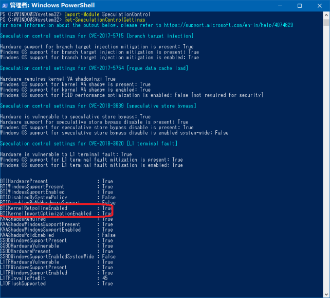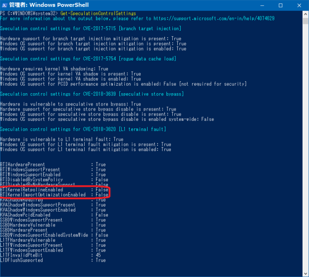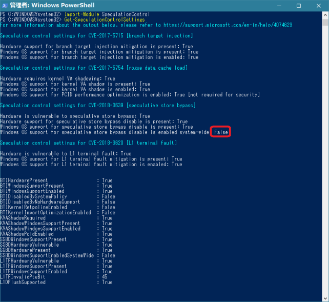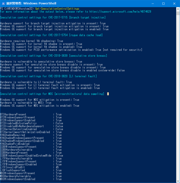 Intel MicroCodeとOSは対応しているが、レジストリエディタでの設定で既定値でOffになっている物は有効にはしていない、HTTの有無では変化無し、何かを行えとの「Suggested actions(推奨されるアクション)」の表示は出ていない。