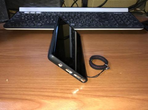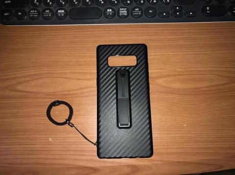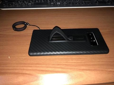 バンドに指を入れて安定してホールドすることができますし、スタンドにもなります。