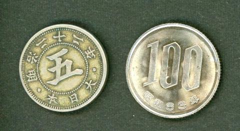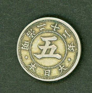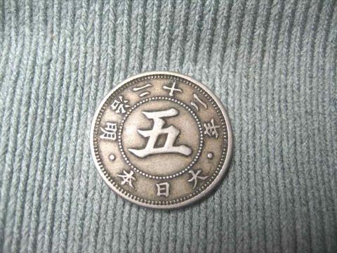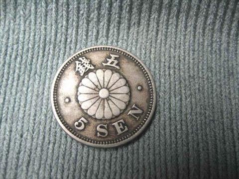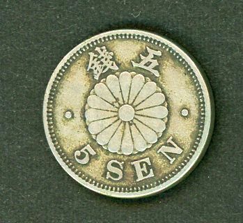 菊の花が描かれた五銭白銅貨です 明治22年(1889年)〜明治30年(1897年)まで発行されました。