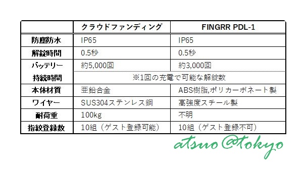 クラウドファンディングの支援額と比べればバッテリー容量、強度、ゲストの指紋登録で劣っている分の金額差は納得できますが、予定売価ほどの差があるとは思えません。