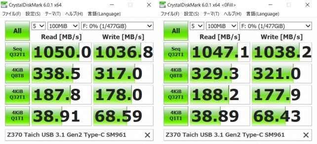 USB Gen2 対応ポータブルSSDを繋いでみたら。ちゃんとGen2相当(10Gbps)の速度が出ていました。