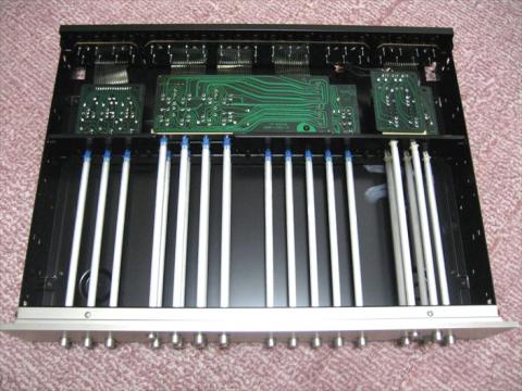 前面パネルからアルミ筒状のシャフトで奥の基板スイッチを切り替えます ちょっとこれには驚きました 信号線を引き回さず入力端子付近で切り替えるという目的なのでしょう。