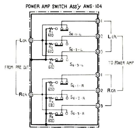 ↓私の接続方法は....図面表示を無視して、プリアンプを通った信号は右側(POWER AMP)に入ってセレクトされ、左から出て、ヘッドホンアンプに流れます ヘッドホンに入った信号は同時にパワーアンプであるレシーバーに供給されSPから音出しするときはレシーバーの操作をします(面倒くさい...) 実際の回路図の使い方とは違いますよ。