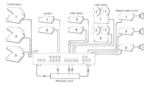 取扱説明書の接続図 プレーヤー3台、チューナー2台、テープデッキ4台、パワーアンプ3台