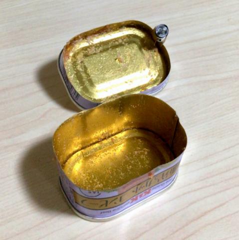 蓋を開けた後、ブリキの「ゴミ」は直接手で触れないように厳重に包んで処分して下さい。