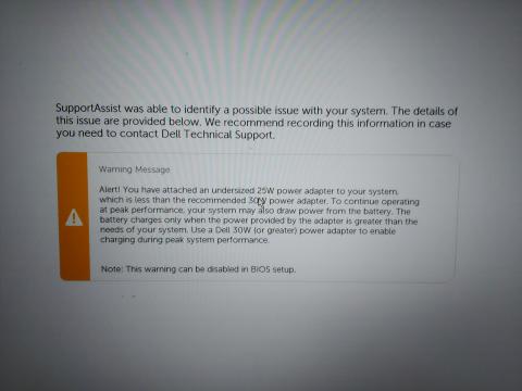 全文英語ですがよくよく読んでみると、『このPCには30W以上の出力のアダプターをつないでね。今使っているアダプターは30W出力に対応してないよ...。BIOS設定でこのメッセージを表示しないようにすることもできるよ。』というような内容でした。