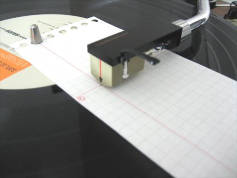 カートリッジ針先と63m/mポイントを合致させます 次にヘッドシェルが罫線と平衡になるようにヘッドシェルとカートリッジの取り付け位置を固定ネジで調整します 外周側でも同様に(調整)確認します。