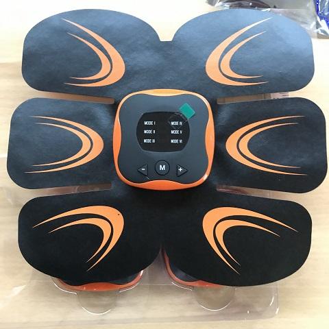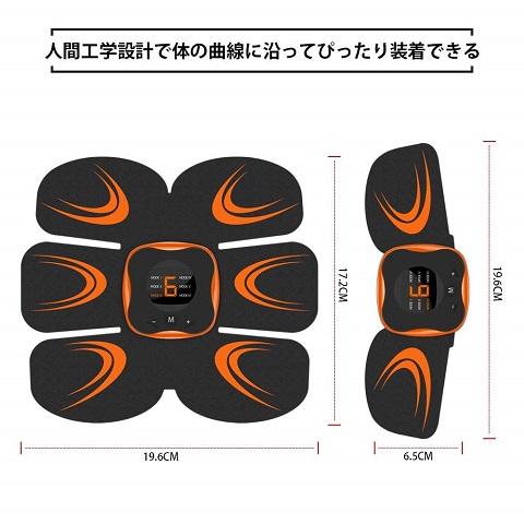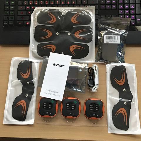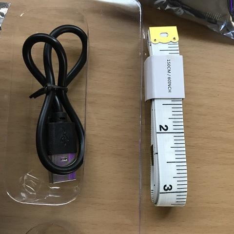 中身を出すと、腹部用シート1枚・腕用2枚・充電式コントローラー3個・片言日本語版取扱説明書・予備用の粘着シート・USBケーブル・そして何故か腹部を計れという事なのか、メジャー付きw