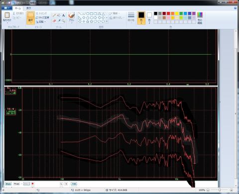 efuさんのWaveGeneと言うソフトでホワイトノイズ.wavを作成、PCで再生しアンプに入力して左CHスピーカーからの音をビデオカメラで撮影録音、そのビデオ映像からWAVEファイルを抜き出して再生して画像にしました 機材は同位置同条件としました。