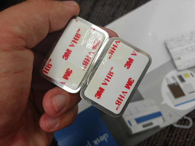 裏面にはマグネットが貼られていて、ここでデスクに固定することになります。ネオジム磁石なので、小さいですがかなり強力に貼りついてくれます。
