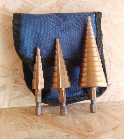 ステップドリルという商品になります。それぞれ最大径が違うものが3本セットでした。