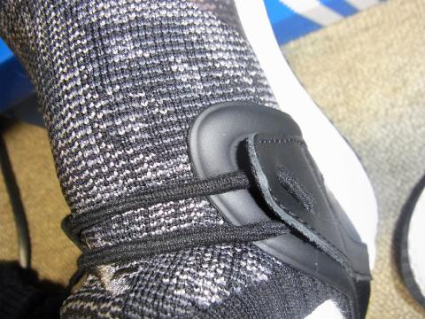 伸縮性の高いEvoknit を横から生えたウレタンみたいなパーツとレザーの紐通しでフィット感を調整する形で