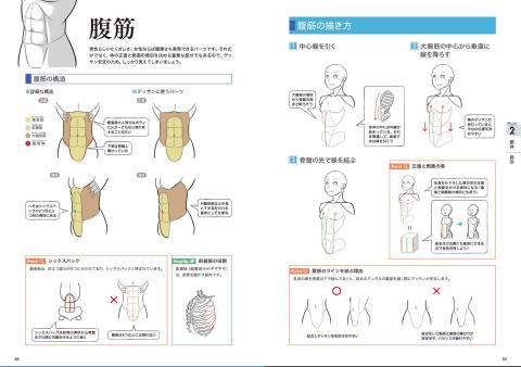 胸、腹、腰、太もも、足、手、そして顔を、解剖図を元にしてデフォルメして描きやすくする方法を詳細に示してくれています。