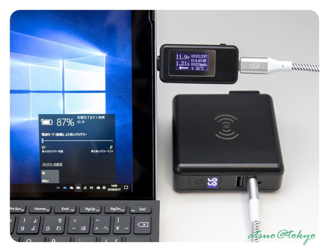 1.5Aには達していませんが、[12V/1.5A]の PDプロファイルで出力されているようで、ちょっと低いですが約14.4Wで出力されており、Surface Go 稼働中でも充電出来ています。